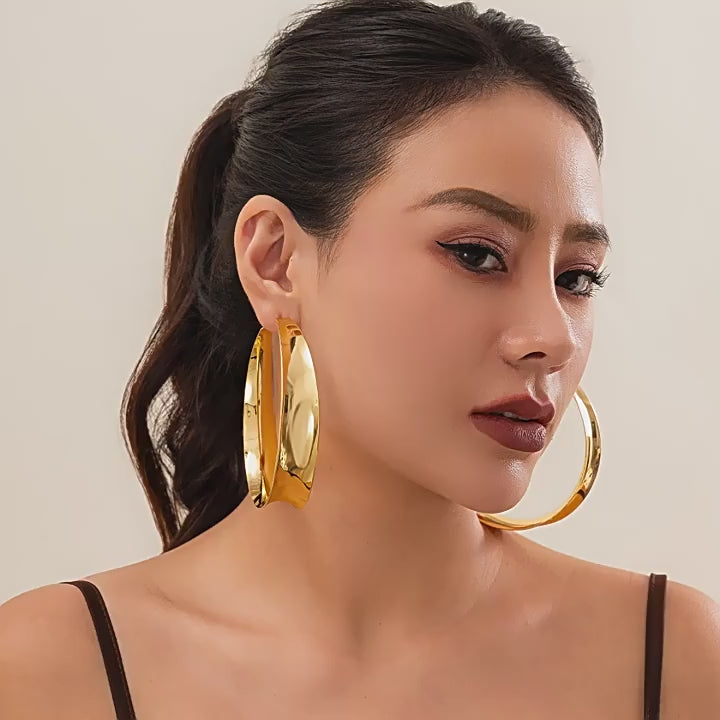 14K Exaggerated metal large circle earrings for women's fashion show, geometric hollow out bright surface earrings